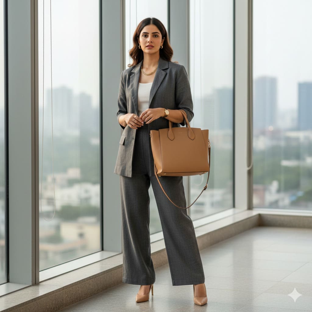 - एक्सेसरीज: इसे न्यूड हील्स, एक क्लासिक लेदर टोट बैग और स्लीक वॉच के साथ पेयर करें। यह लुक दिखाता है कि आप अपने काम और स्टाइल दोनों के प्रति गंभीर हैं।