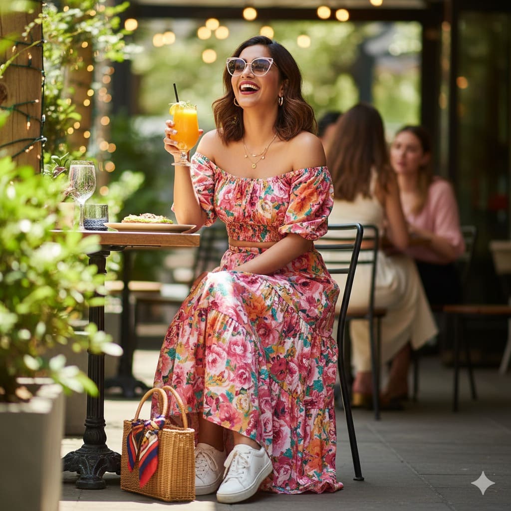 - प्रिंट्स का चुनाव: फ्लोरल, बोहो या वाइब्रेंट ज्योमेट्रिकल प्रिंट्स ब्रंच के लिए परफेक्ट हैं। शॉर्ट टॉप और फ्लेयर्ड पैंट्स वाला सेट यहाँ काफी फबता है।