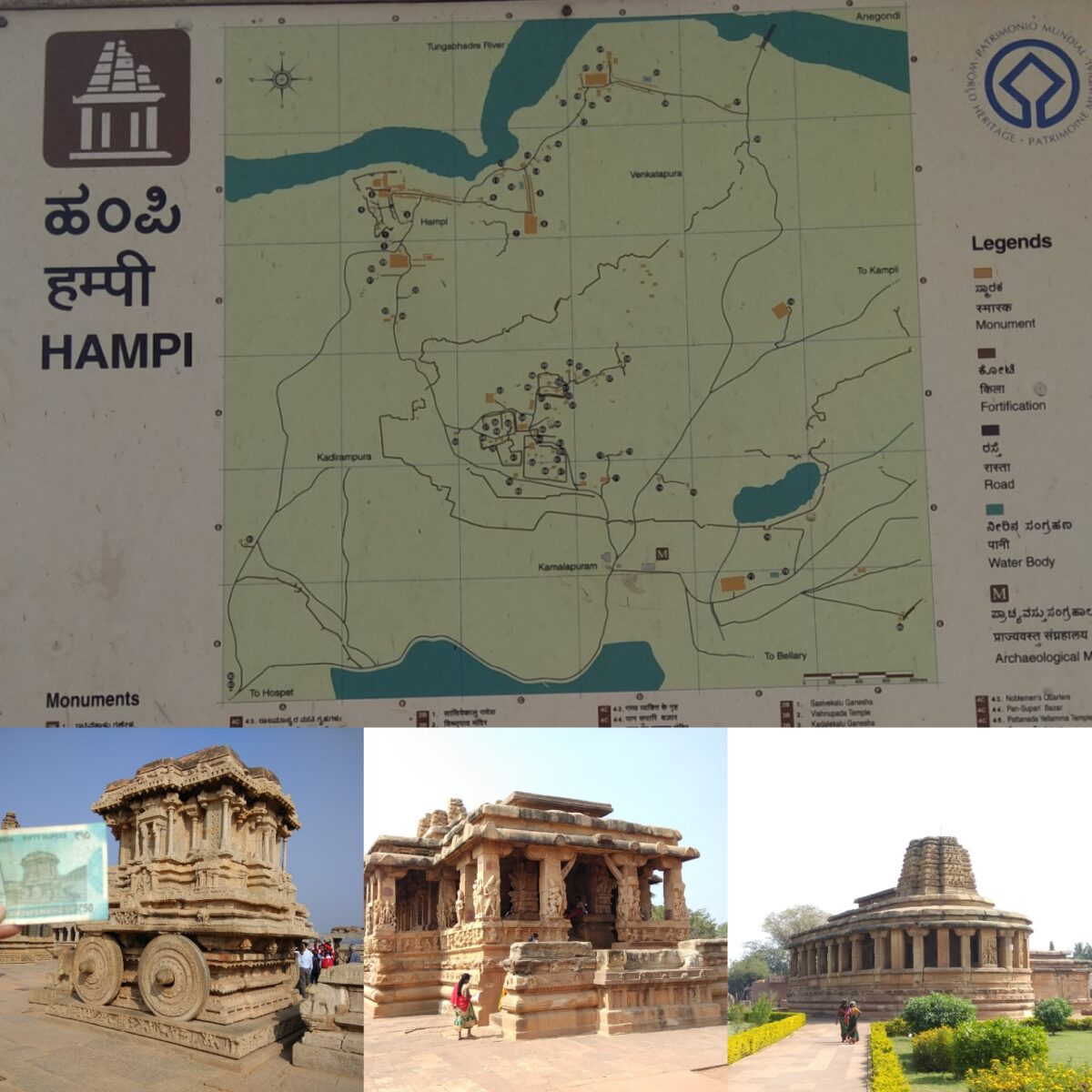 विजाया विठ्ठला मंदिर: दक्षिण भारत की ऐतिहासिक मंदिरों में से एक और बड़े ही इत्मीनान से तराशे गए मंदिर के खंभे, आपको भी अचरज में डाल देंगे। हम्पी के रथ का चित्र नेट का चित्र आप भारतीय रिजर्व बैंक के पचास रूपये के नोट पर भी देख सकते हैं।