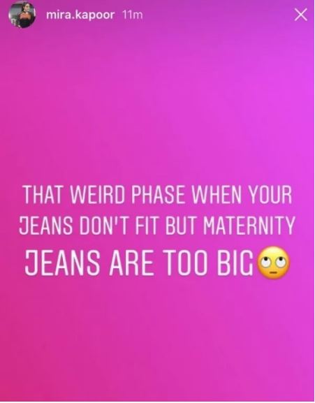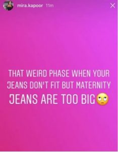 मीरा ने इंस्टा स्टोरी में लिखा है, ‘ये बहुत अजीब होता है जब आपकी जींस आपको फिट नहीं आती लेकिन आपकी मैटरनिटी जींस बहुत बड़ी होती है।’ बता दें कि मीरा राजपूत दूसरी बार मां बनने जा रही हैं. कुछ दिनों पहले ही सोनम कपूर की शादी पर शाहिद और मीरा स्पॉट हुए थे। इस दौरान मीरा काफी ढीले कपड़े पहने हुए नजर आईं थी।